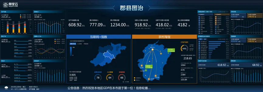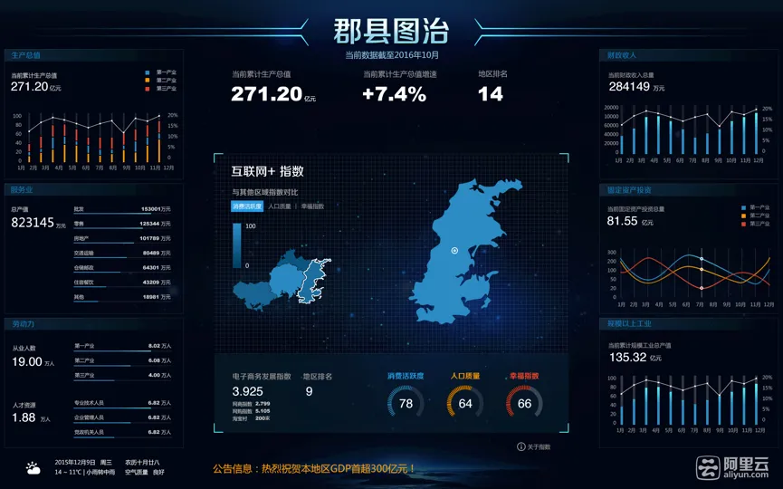 它通过整合政府统计数据和互联网数据源,郡县图治集中呈现区域基础及特色产业、内需消费、智慧民生、舆论舆情等各类关键指标,为政府和组织绘制一张互联网+区域经济的全景大图,为宏观经济决策提供分析依据和辅助支撑。