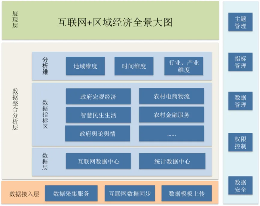 (2)数据整合分析层:通过对统计数据和互联网+数据做统一的整合处理,形成多个主题指标库,并以此为基础从时间序列、地理信息、行业等多个维度对地区经济画像。