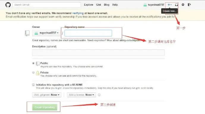 首先,登录github上,然后在右上角找到“create a new repo”创建一个新的仓库。如下: