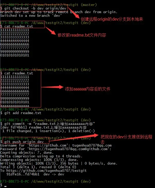 可以看到 推送成功了,如果我们现在要推送到其他分支,比如dev分支上,我们还是那个命令 git push origin dev
