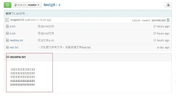 如上可以看到,readme.txt文件内容从一行11111111改成 二行 添加了一行22222222内容。