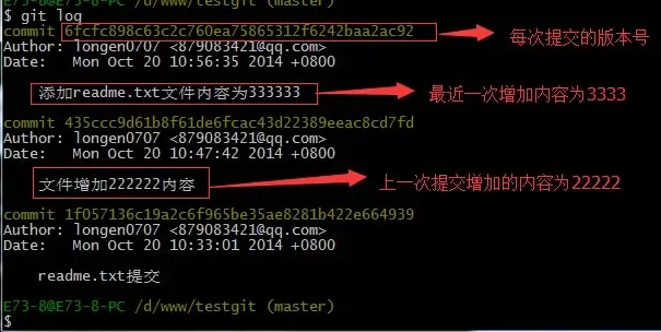 git log命令显示从最近到最远的显示日志,我们可以看到最近三次提交,最近的一次是,增加内容为333333.上一次是添加内容222222,第一次默认是 111111.如果嫌上面显示的信息太多的话,我们可以使用命令 git log –pretty=oneline 演示如下: