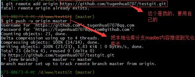 git remote add origin https://github.com/tugenhua0707/testgit 关联一个远程库