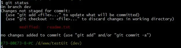 我们在readme.txt再添加一行内容为4444444,接着在目录下新建一个文件为test.txt 内容为test,我们先用命令 git status来查看下状态,如下: