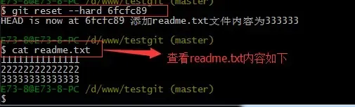我们看到 增加333333 内容我们没有看到了,但是现在我想回退到最新的版本,如:有333333的内容要如何恢复呢?我们可以通过版本号回退,使用命令方法如下: