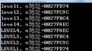void up_and_down(int n) { printf("level%d, n地址=%p\n", n, &n); if (n < 4) { up_and_down(n + 1); } printf("LEVEL%d, n地址=%p\n", n, &n); }