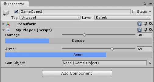 这个是比较常用,用于对对象界面的扩展,比如一个对象的属性,可以像下面一样 注意damage和armor只是一个普通变量,而现在,我们可以让使用者使用拖动的方式来配置。 这样就限制了变量的范围。