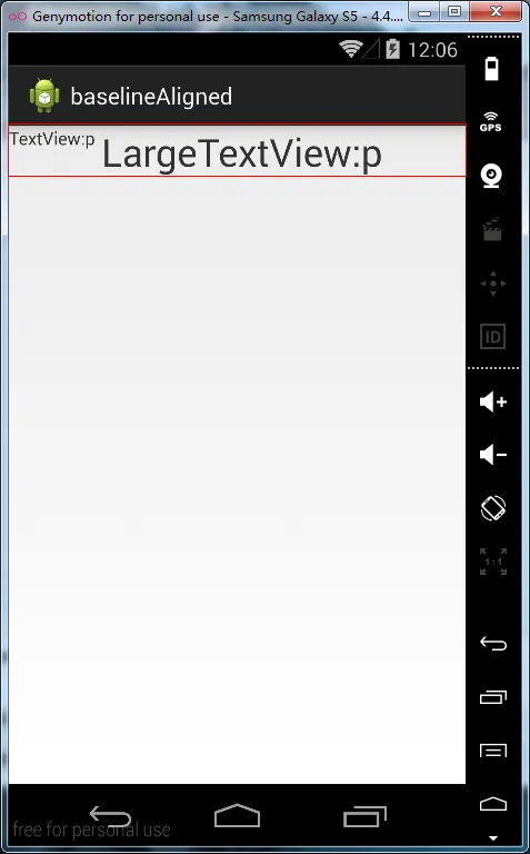 1 <LinearLayout xmlns:android="http://schemas.android.com/apk/res/android" 2 xmlns:tools="http://schemas.android.com/tools" 3 android:layout_width="match_parent" 4 android:layout_height="wrap_content" 5 android:baselineAligned="false" 6 android:orientation="horizontal"> 7 8 <TextView 9 android:layout_width="wrap_content" 10 android:layout_height="wrap_content" 11 android:layout_marginRight="5dip" 12 android:text="TextView:p" /> 13 <TextView 14 android:layout_width="wrap_content" 15 android:layout_height="wrap_content" 16 android:layout_marginRight="5dip" 17 android:textSize="30sp" 18 android:text="LargeTextView:p" 19 /> 20 </LinearLayout>