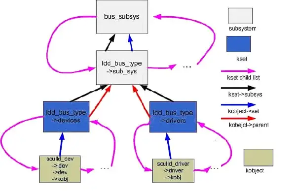 bus->subsys.kobj.kset = &bus_subsys; //将其kset指向bus_subsys.,如何理解? 看看ldd_bus_type指向bus_subsys的那条蓝线