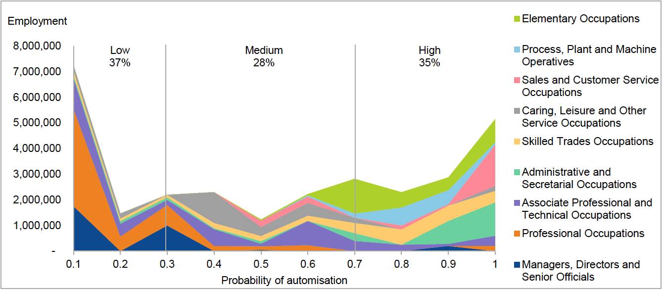 例如,随着人工智能所能处理的行政工作逐渐增多,律师助理或类似专业人士的需求可能会在未来几年减少。在英国,超过35万律师助理、工资经理、记账员可能因为自动化系统的发展而失去工作。