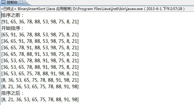 import java.util.*; public class BinaryInsertSort { private static int[] Sort(int[] arr) { int i, j; //保存中间插入的值 int insertNote = 0; //将待排序的数列保存起来 int[] array = arr; System.out.println("开始排序:"); for (i = 1; i < array.length; i++) { int low = 0; int high = i - 1; insertNote = array[i]; //不断的折半 while (low <= high) { //找出中间值 int mid = (low + high) / 2; //如果大于中间值 if (array[i] > array[mid]) { //在大于中间值的那部分查找 low = mid+1; } else //在小于中间值的那部分查找 high = mid-1; } //将整体数组向后移 for ( j=i; j > low; j--) { array[j] = array[j - 1]; } //插入到指定的位置 array[low] = insertNote; System.out.println(Arrays.toString(array)); } System.out.println("排序之后:"); System.out.println(Arrays.toString(array)); return array; } public static void main(String[] args) { Random random = new Random(); int[] array = new int[10]; for (int i = 0; i < 10; i++) { array[i] = Math.abs(random.nextInt() % 100); } System.out.println("排序之前:"); System.out.println(Arrays.toString(array)); BinaryInsertSort.Sort(array); } }