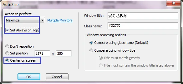在弹出的窗口中,按下图所示进行选择,注意“Set Always on Top”要被勾上,而且“Center on screen”要被选中,否则爱奇艺视频窗口仍然显示不出来:
