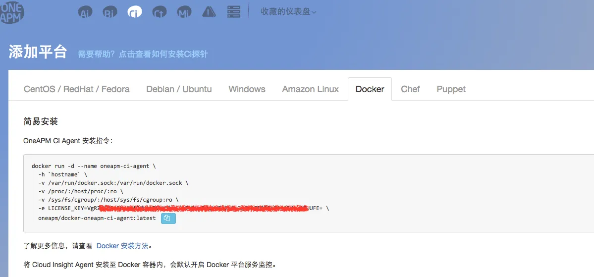登录OneAPM,选择CI,点击左侧菜单条->平台->平台,选择添加平台。平台添加示例里包含LICENSE_KEY,记录LICENSE_KEY。
