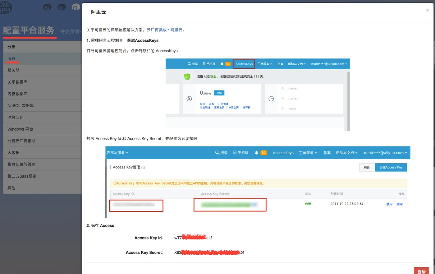 登录OneAPM,点击左侧菜单条->设置->配置平台服务,选择所有,点击阿里云。根据下面的界面填入阿里云控制台提供的AccessKeys,点击保存。
