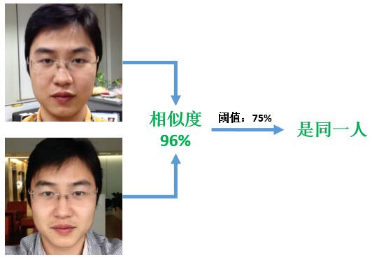 它的输入是两个人脸特征,通过人脸比对获得两个人脸特征的相似度,通过与预设的阈值比较来验证这两个人脸特征是否属于同一人(即相似度大于阈值,为同一人;小于阈值为不同)。