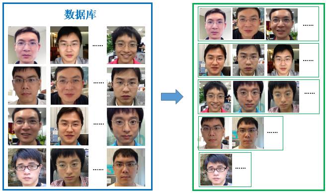 △ 人脸聚类过程(右侧绿框内按身份的分组结果为聚类结果)