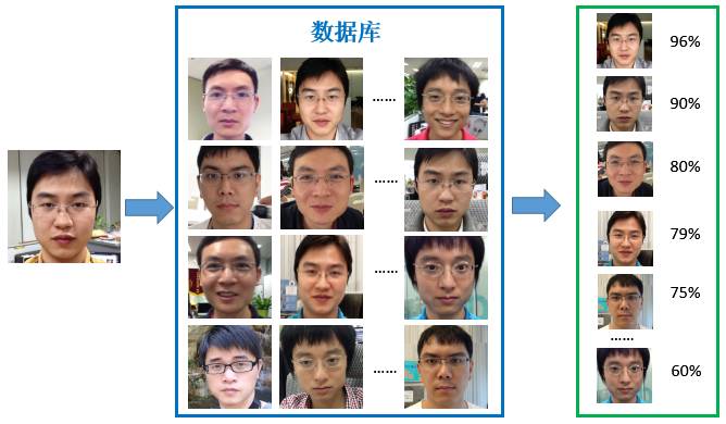 人脸检索通过将输入的人脸和一个集合中的说有人脸进行比对,根据比对后的相似度对集合中的人脸进行排序。根据相似度从高到低排序的人脸序列即使人脸检索的结果。