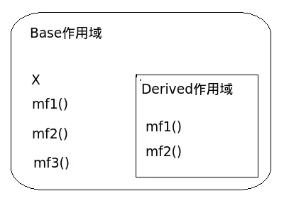 编译器在查找目标内容时,首先在local作用域中查找,就是途中的Derived作用域,如果没有找到我们需要的内容,就会向外移动,在Base作用域中开始查找。