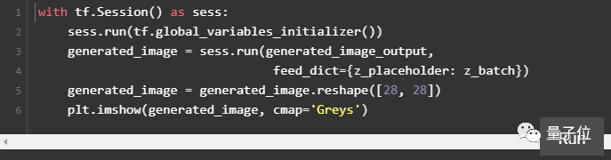 第二个参数相当于一个输入字典,在运行时可以取代计算图,也就是我们要填到占位符里的。在我们的例子中,我们需要将z_batch变量输入到之前定义的z_placeholder中,之后在PyPlot中将图片重新调整为28*28像素。
