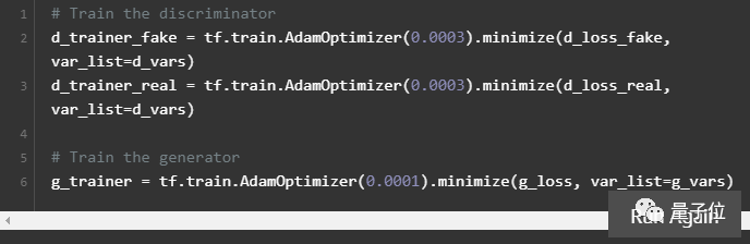 下一步,你需要制定两个优化器,我们一般选择Adam优化算法,它利用了自适应学习速率和动量。我们调用Adam最小函数并且指定我们想更新的变量——也就是我们训练生成器时的生成器权重和偏差,和我们训练判别器时的判别器权重和偏差。