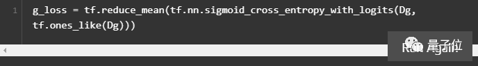 现在我们来设置生成器的损失函数。我们想让生成网络的图像骗过判别器:当输入生成图像时,判别器可以输出接近1的值,来计算Dg与1之间的损失。