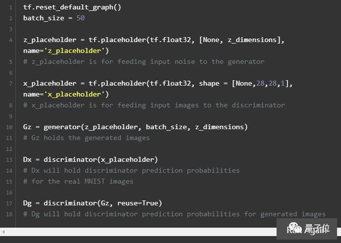 首先打开TensorFlow,为我们的生成器创建一个占位符。占位符的形式是None x z_dimensions,关键字None意味着可以在运行会话时确定它的值。我们通常用None作为我们第一个维度,所以我们的批处理大小是可变的。有了关键词None,所以不需要指定batch_size。