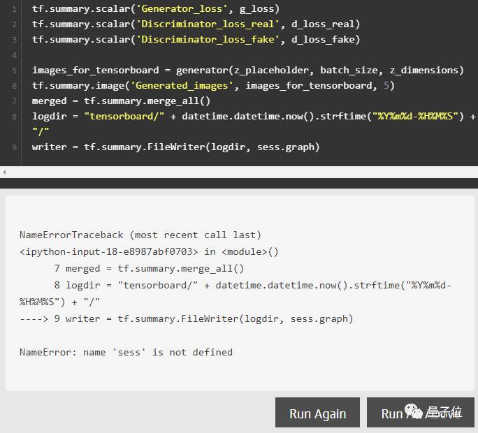 如果在自己的机器上运行此脚本,要记得包含下面的cell。之后在终端窗口中运行 tensorboard —logdir=tensorboard/ ,再在浏览器中输入http://localhost:6006,打开TensorBoard。
