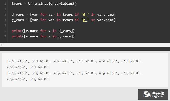 为了使这些看起来不同,我们需要创建两个变量列表,一个是判别器的权重和偏差,另一个是生成器的权重和偏差。这就是当给TensorFlow变量取名字需要深思熟虑的原因。