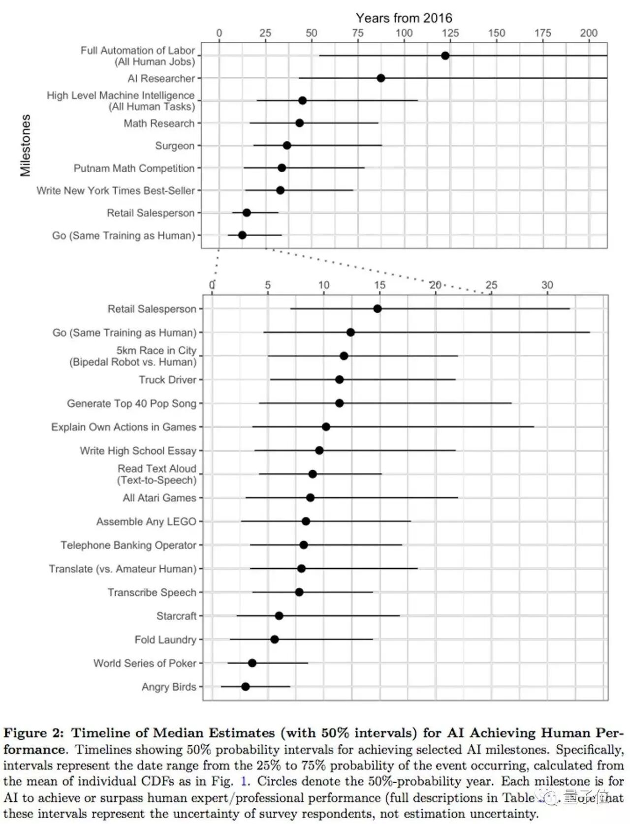 在这次调查结果显示,到2061年机器将比人类更好得完成工作任务,人类社会将达到“高水平机器智能”(high-level machine intelligence,HLMI)水平。也就是从此时,人工智能开始在社会中占据主导地位。