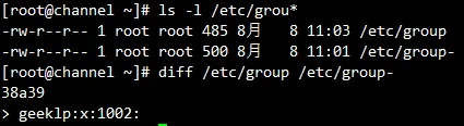 今天查看/etc/group时,意外发现另外一个/etc/group-,查看了一下2个文件,发现大部分内容是一致的。这就有点搞不懂了,后面这个group是有啥用呢呢?diff对比了一下,相比group文件,group-多了一行,其他内容都一样。