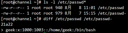 又看了一下passwd文件,同一个目录下面,有passwd与passwd-二个类似的文件,diff对比一下,passwd-比passwd多了一行,其他内容均一致。