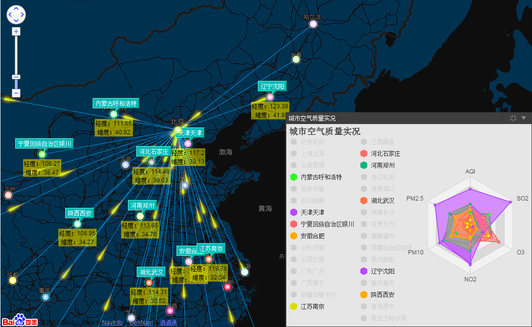 前一篇谈及到了ECharts整合HT for Web的网络拓扑图应用,后来在ECharts的Demo中看到了有关空气质量的相关报表应用,就想将百度地图、ECharts和HT for Web三者结合起来也做一个类似空气质量报告的报表+拓扑图应用,于是有了下面的Demo:http://www.hightopo.com/demo/blog_baidu_20150928/ht-baidu.html