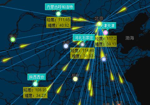 在这个Demo中,将GraphView拓扑图组件添加到百度地图组件中,覆盖在百度地图组件之上,并且在百度地图组件上和GraphView拓扑图组件上分别添加事件监听,相互同步经纬度和屏幕位置信息,从而来控制拓扑图上的组件位置固定在地图上,并在节点和节点之间的连线上加上了流动属性。右下角的图标框是采用HT for Web的Panel面板组件结合ECharts图表组件完成的。
