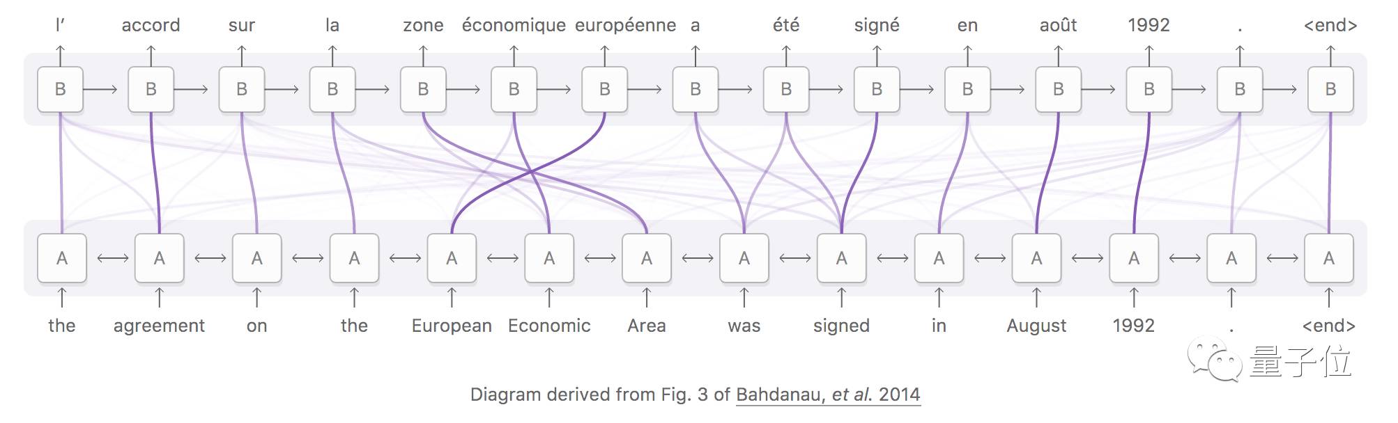 下图的例子,是将英语翻译成法语。在输出翻译的过程中,你可以看到该网络“注意”到输入序列的不同部分。