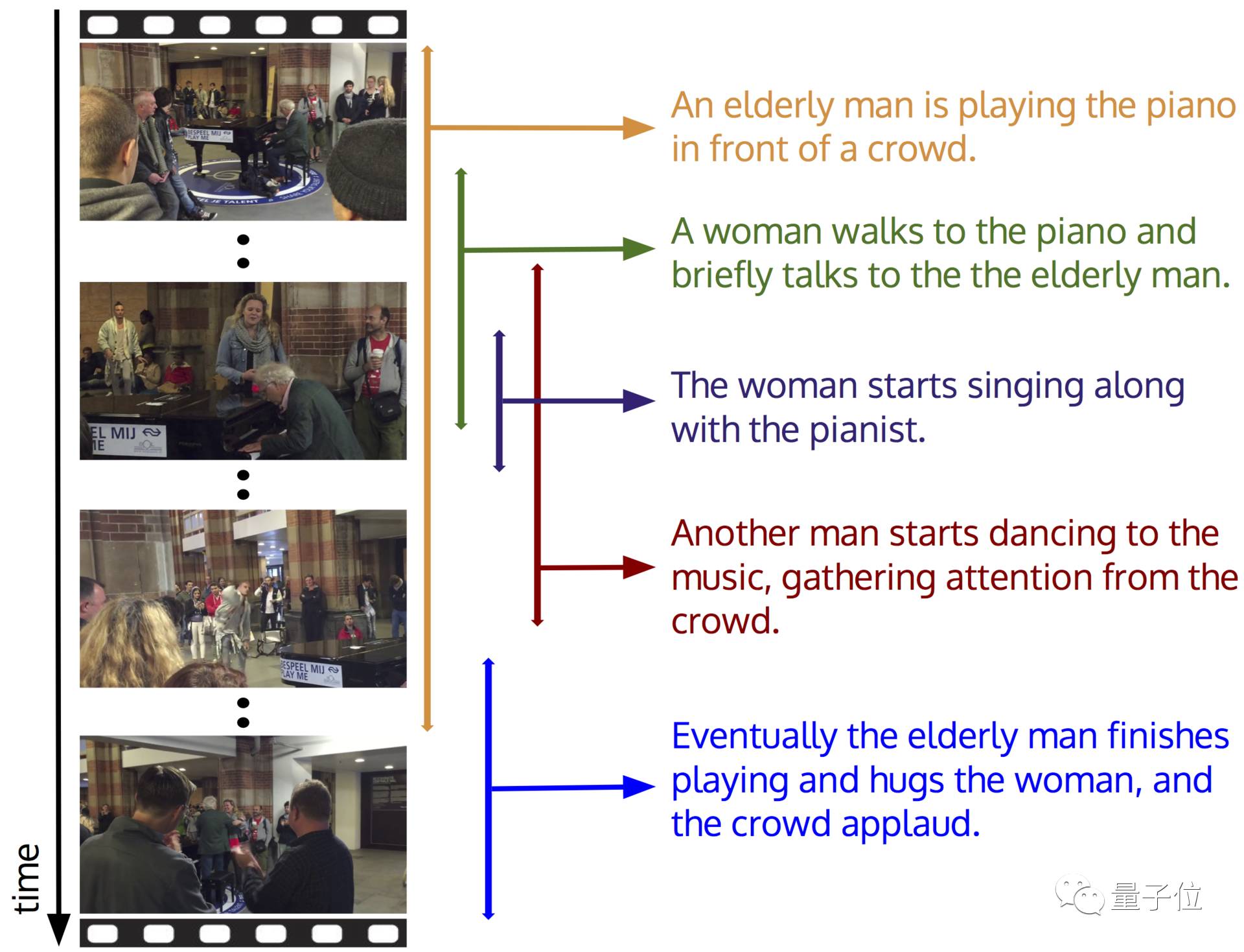 大多数视频都包含着大量事件。举个例子吧,比如在一段钢琴演奏的视频中,可能不仅仅包含钢琴演奏者,还可能包含着一群跳舞的人,或者一群鼓掌的观众,这些事件很可能是同时发生的。当一段视频中包含检测内容和描述内容时,我们称它为“字幕密集型事件”。