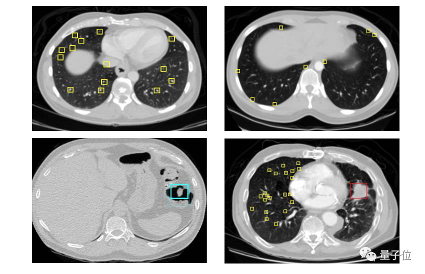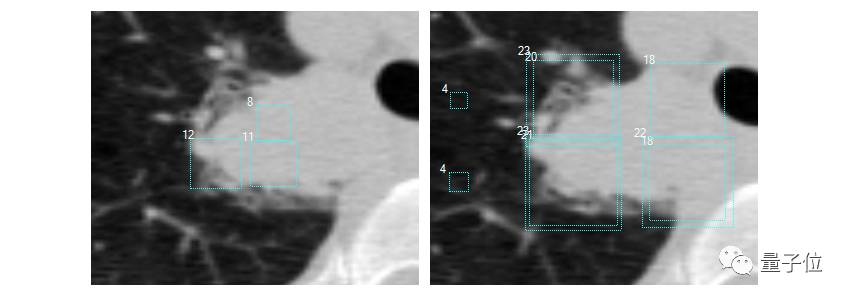 图4:在缩放1x的左图中,没有很好地检测到大结节;但是在2x放大的右图时,效果较好。矩形的大小表示坚持到的恶性肿瘤。