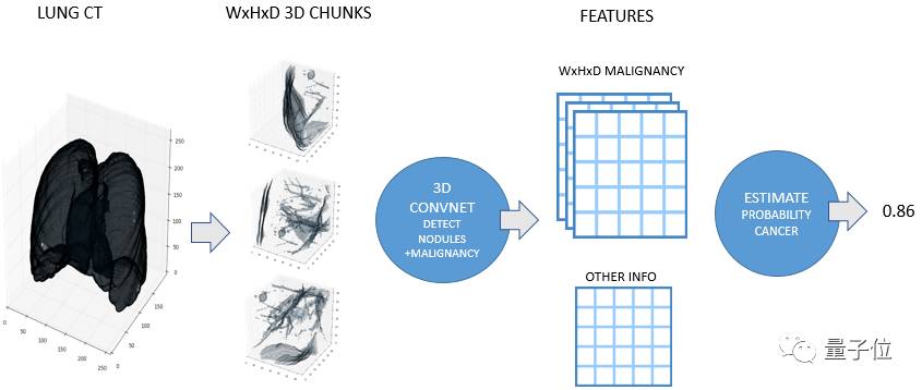Julian de Wit和Daniel Hammack合作完成的解决方案获得了比赛的第二名。Wit最近写了一篇博客来介绍他们的方案。他们通过3D卷积神经网络,来构建结节探测器,预测患癌可能性。Wit在64位的Windows10系统下,结合TensorFlow 0.12.0和Keras库实现该网络模型。