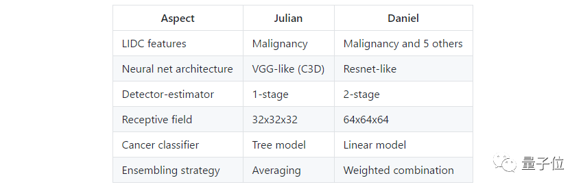 我们这次组队,一开始就发现两个人对LIDC数据集中的恶性信息有完全相同的观察角度,解决方案也很相似,感到有点失望。不过幸运的是,剩余部分的设计方法完全不同,结合后显著改进了LB排名和本地CV值。下面列举出一些主要的区别。
