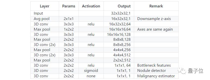 我首先调整了输入大小,设置为32x32x32 mm。这看起来可能太小,但是在后续的网络层中加入一些技巧,发现这种维度的实际效果很好。这个想法是保持一切轻量化,并在比赛结束后再建立一个更大输入维度的网络。但是由于Daniel的网络输入是64x64x64 mm,我决定保持目前的输入大小,使网络的输出互补。接下来我立即对z轴进行平均池化操作,使得每个体素表示2mm的区域。这进一步减少了网络的参数量,并没有影响到精度,因为在大多数扫描中,z轴会比x轴和y轴更粗糙。最后,我在网络顶部引入了64个节点的全连接层。这里,我们不是直接预测恶性肿瘤,而是通过训练图片的中级特征,输出结节的恶化程度。