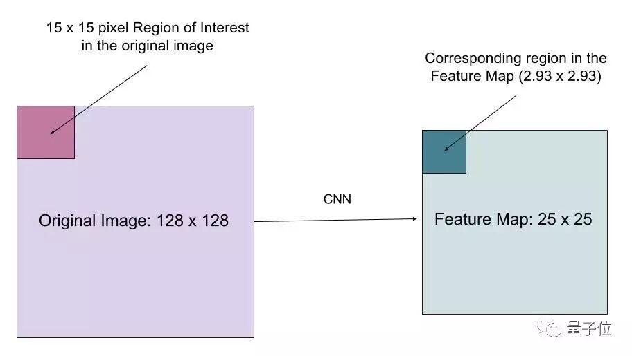 我们知道原始图像中的每个像素对应于特征图谱中的25/128个像素。要从原始图像中选择15像素,我们就在特征图谱中选择15*(25/128)=2.93个像素。
