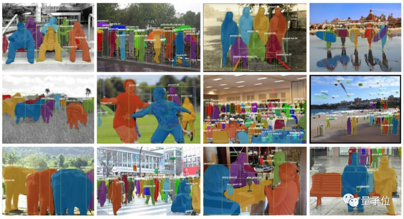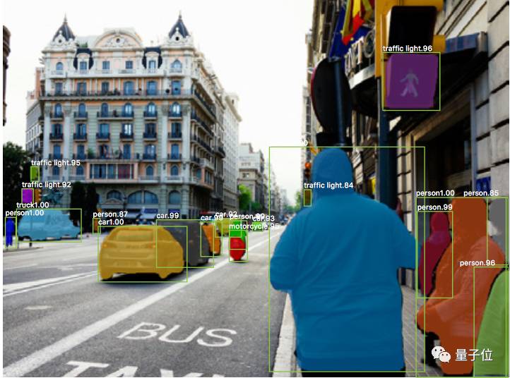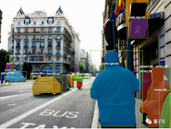 Mask R-CNN在生成这些掩码后,将它们与Faster R-CNN输出层的对象类别和边界框组合起来,产生了奇妙的精确分割。