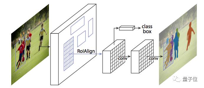 图18:图像舍弃RoIPool技术,通过RoIAlign技术传递,使得由RoIPool选择的特征图谱区域更精准地对应原始图像的区域。这是很有必要的,因为与用边界框确定坐标相比,像素级分割需要更精细的像素对齐。