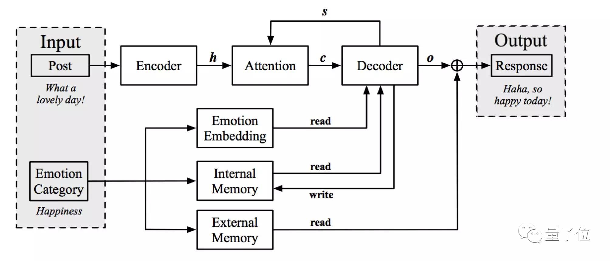 模型的总体框架如图 1 所示,用户问题输入为“What a lovely day!”,通过 Encoder 将其编码为隐向量表示 h,然后通过注意力机制,结合 decoder 的状态向量 s 在生成不同的词时,对问题的隐向量表示 h 的不同部分的信息选择性的加强,得到向量 c。指定情感类别为“Happiness”,经过索引得到情感类别嵌入向量,初始的情感状态记忆向量和相应的情感词表。decoder 接受经过注意力机制的问题向量 c,情感类别嵌入向量和初始的情感状态记忆向量作为输入,通过循环神经网络生成下个词的生成概率 o,之后再经过情感词表对情感词和非情感词的加权,得到最终词的生成概率,通过采样即可得到输出“Haha, so happy today!”。