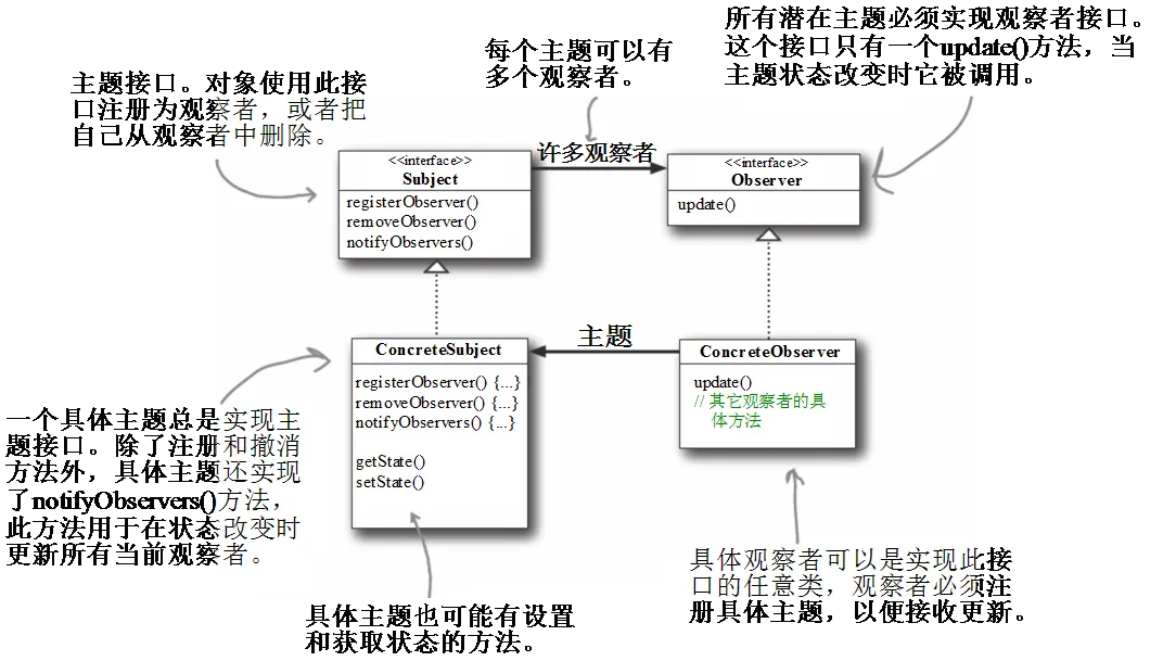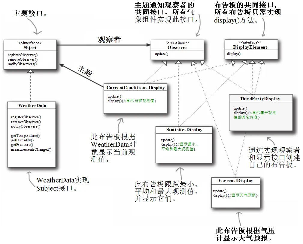 1 public interface Subject 2 { 3 void RegisterObserver(Observer o);//这两个方法都需要一个观察者作为参数,该观察者是用来注册或被删除的。 4 void RemoveObserver(Observer o); 5 void NotifyObservers();//当主题改变状态时,这个方法会被调用,以通知所有的观察者 6 }