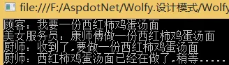 1 class Program 2 { 3 static void Main(string[] args) 4 { 5 Customer customer = new Customer("西红柿鸡蛋汤面"); 6 Waiter waiter = new Waiter(customer); 7 Cook cook = new Cook(customer); 8 //订餐 动作 9 customer.OrderMeal(); 10 Console.Read(); 11 } 12 }
