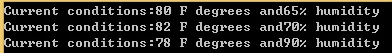 1 class Program 2 { 3 static void Main(string[] args) 4 { 5 //首先创建weatherData对象 6 WeatherData weatherData = new WeatherData(); 7 CurrentConditionsDisplay currentDisplay = new CurrentConditionsDisplay(weatherData); 8 weatherData.SetMeasurements(80, 65, 30.4f); 9 //通知 10 weatherData.NotifyObservers(); 11 weatherData.SetMeasurements(82, 70, 29.2f); 12 weatherData.NotifyObservers(); 13 weatherData.SetMeasurements(78, 90, 29.2f); 14 weatherData.NotifyObservers(); 15 Console.Read(); 16 } 17 }