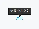1 <!DOCTYPE html> 2 <html xmlns="http://www.w3.org/1999/xhtml"> 3 <head> 4 <meta http-equiv="Content-Type" content="text/html; charset=utf-8" /> 5 <title></title> 6 <!--css文件--> 7 <link href="Colortip/styles.css" rel="stylesheet" /> 8 <link href="Colortip/colortip-1.0/colortip-1.0-jquery.css" rel="stylesheet" /> 9 </head> 10 <body> 11 <div style="text-align:center;margin-top:200px;"><a href="#" title="这是个大美女">美女</a></div> 12 <div style="text-align:center;margin-top:250px;"><a href="#" title="这是个大美女" class="black">美女</a></div> 13 </body> 14 </html> 15 <!--引入需要的js--> 16 <script type="text/javascript" src="Script/jquery-1.11.0.js"></script> 17 <script type="text/javascript" src="Colortip/colortip-1.0/colortip-1.0-jquery.js"></script> 18 <script type="text/javascript" src="Colortip/script.js"></script>