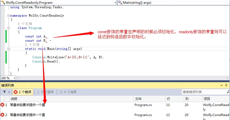 const修饰的常量在声明的时候必须初始化,readonly修饰的常量则可以延迟到构造函数中初始化。