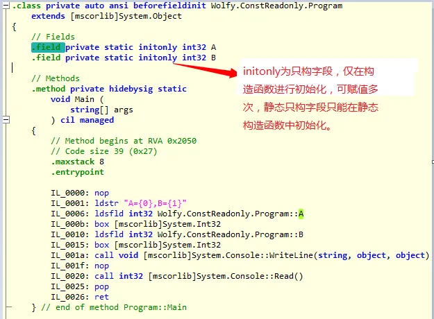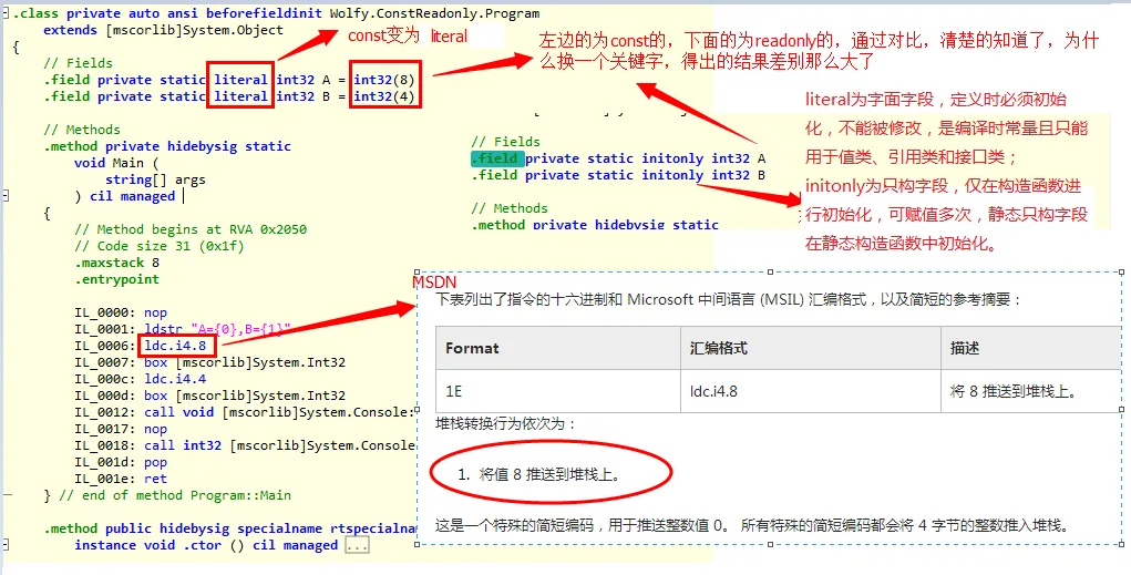 那么这个面试题的IL是什么样子的呢?这里为了方便对比,将readonly的IL部分贴到一起,方便对比。