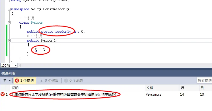 1 using System; 2 using System.Collections.Generic; 3 using System.Linq; 4 using System.Text; 5 using System.Threading.Tasks; 6 7 namespace Wolfy.ConstReadonly 8 { 9 class Person 10 { 11 public static readonly int C; 12 static Person() 13 { 14 C = 3; 15 } 16 } 17 }